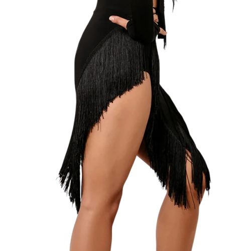 Μαύρο ενιαίο φόρεμα με ασύμμετρο κόψιμο και κορδόνια τα οποία σας επιτρέπουν να επιλέξετε το ύψος του σχισίματος στα πόδια, ρυθμίζοντας με αυτό τον τρόπο αν επιθυμείτε μια απόλυτα κομψή ή μια περισσότερο sexy Latin εμφάνιση.